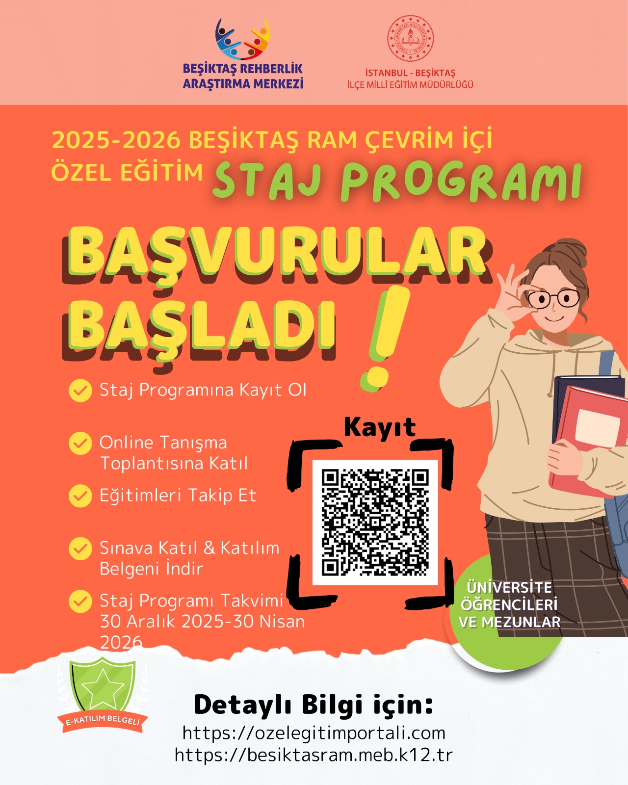 Bölümlerinde lisans ve yüksek lisans düzeyindeki öğrenciler 31 Aralık 2025 tarihine kadar https://besiktasram.meb.k12.tr/ resmi web adresinden Çevrim İçi Özel Eğitim Staj Programına kayıt olabilirler.
