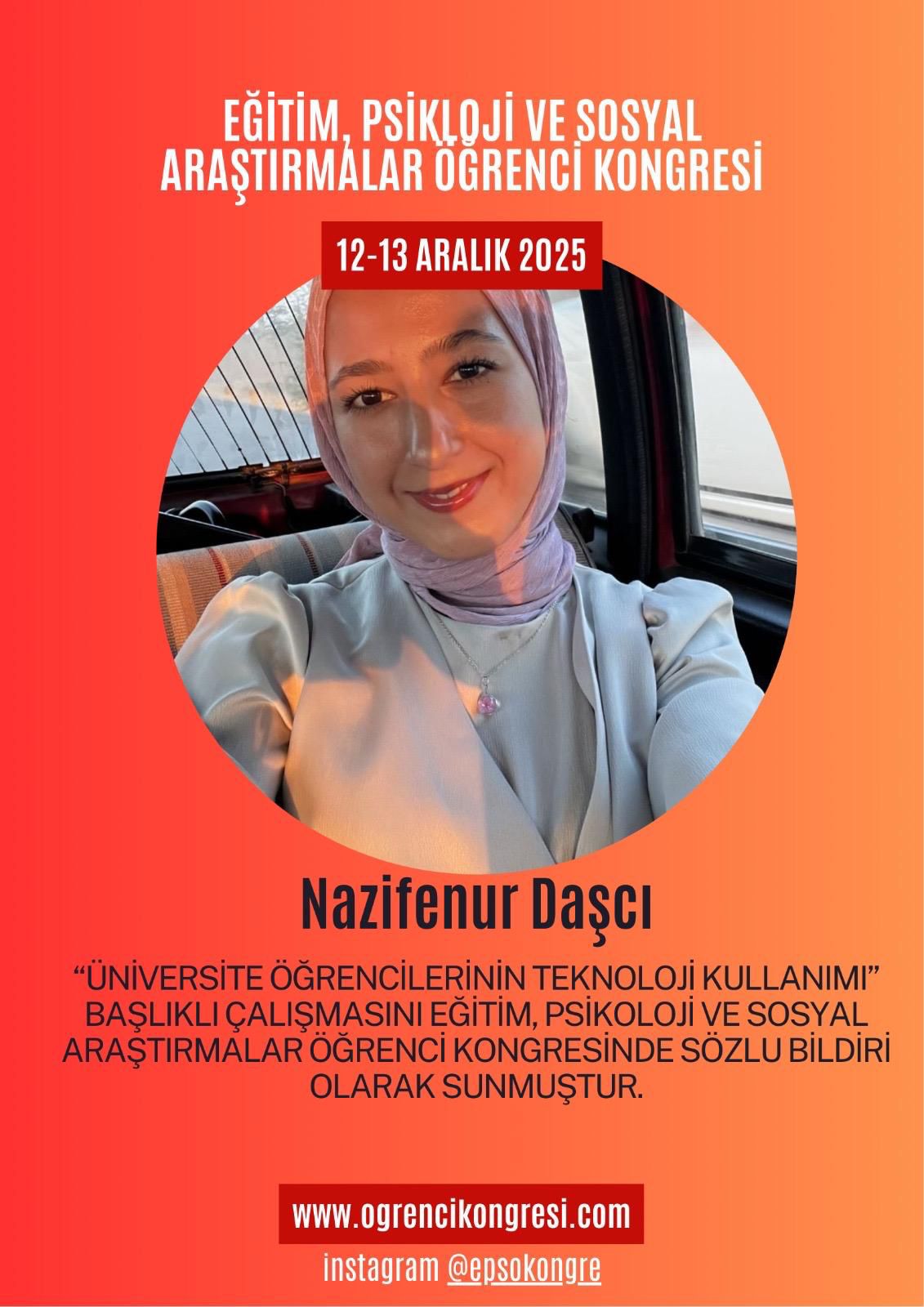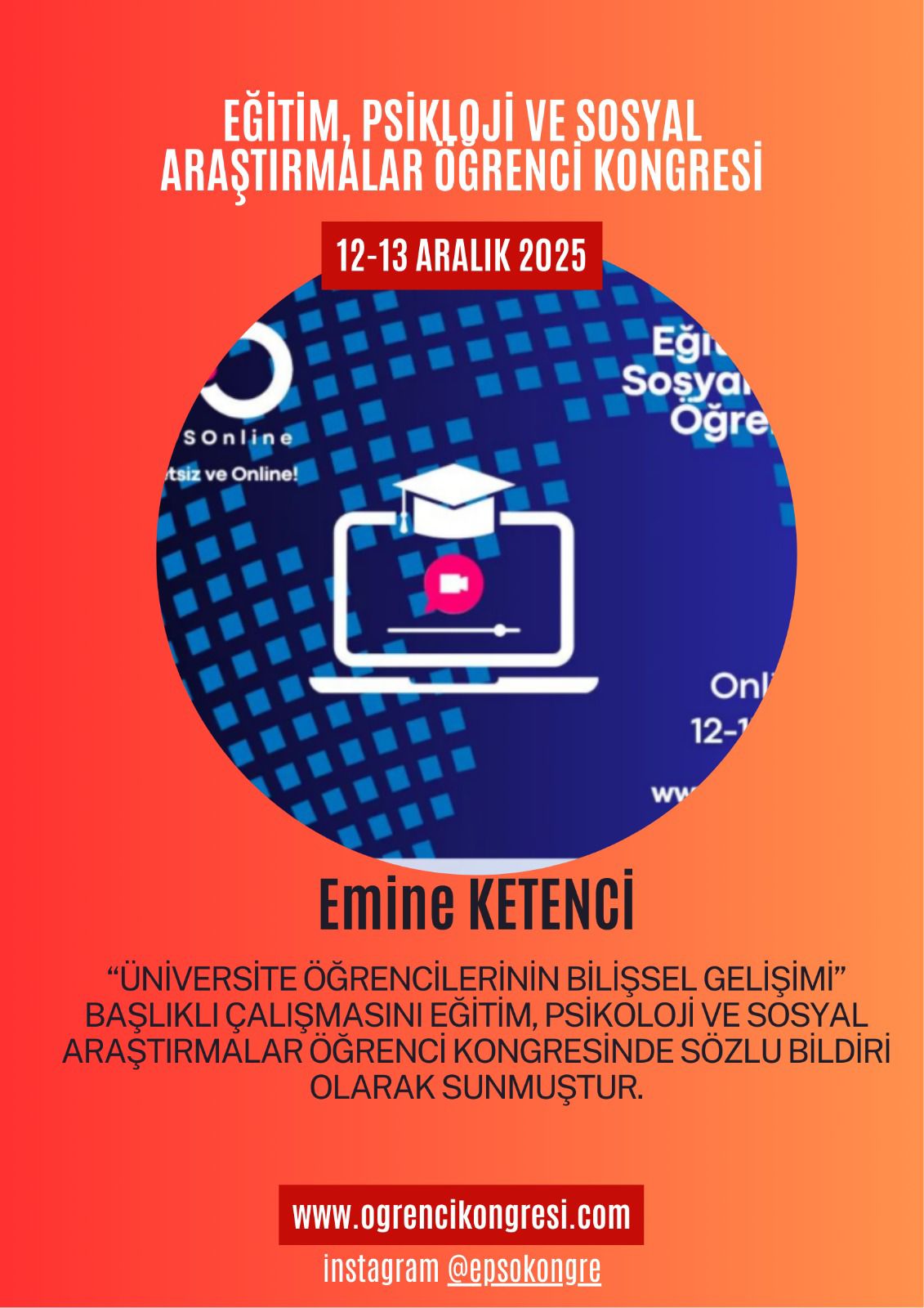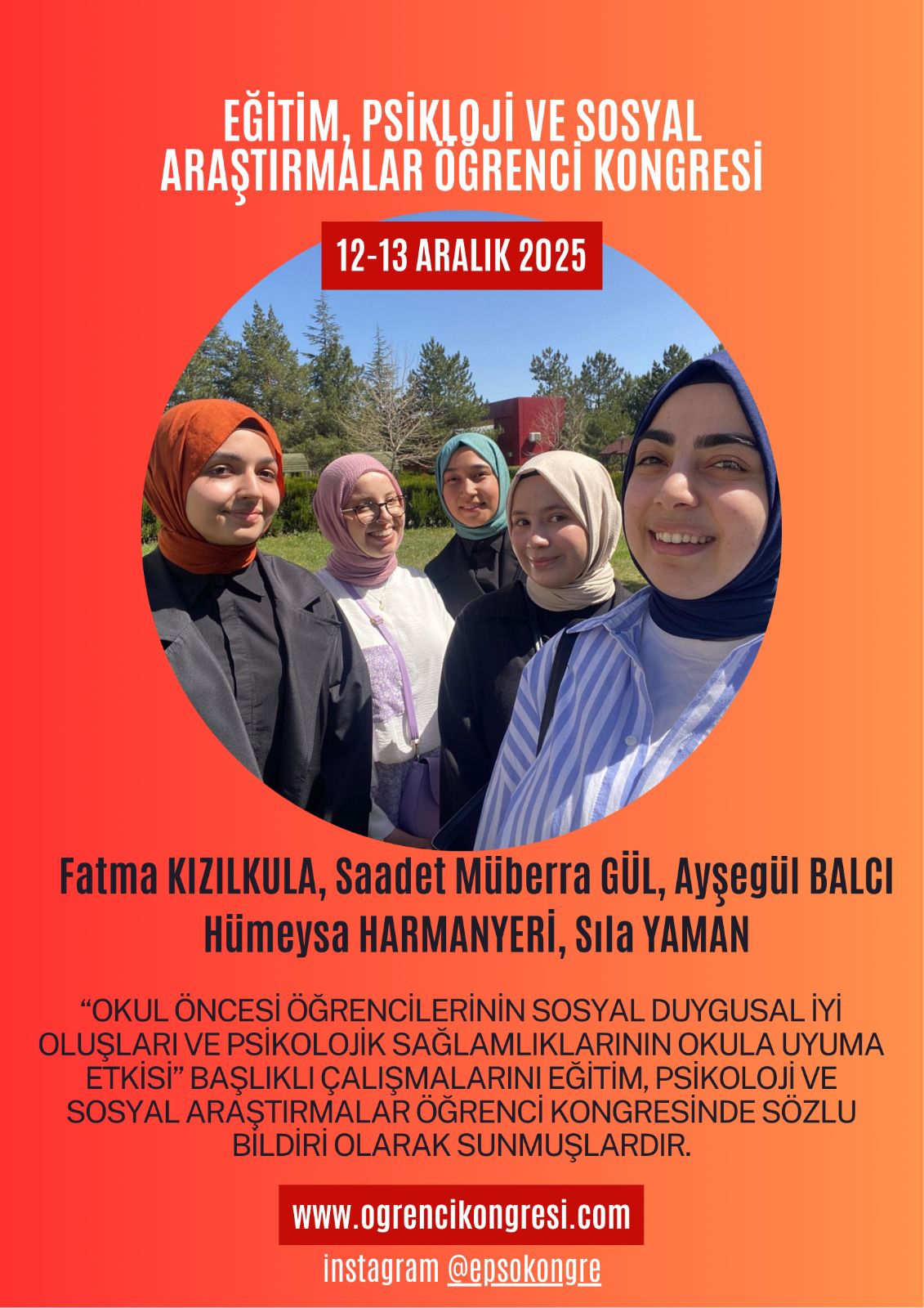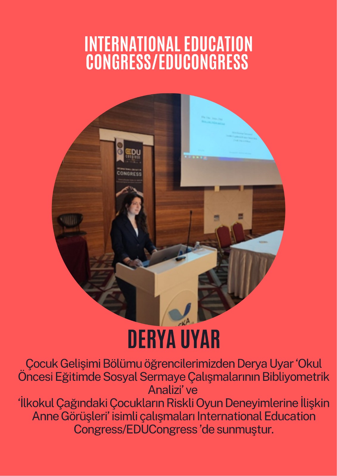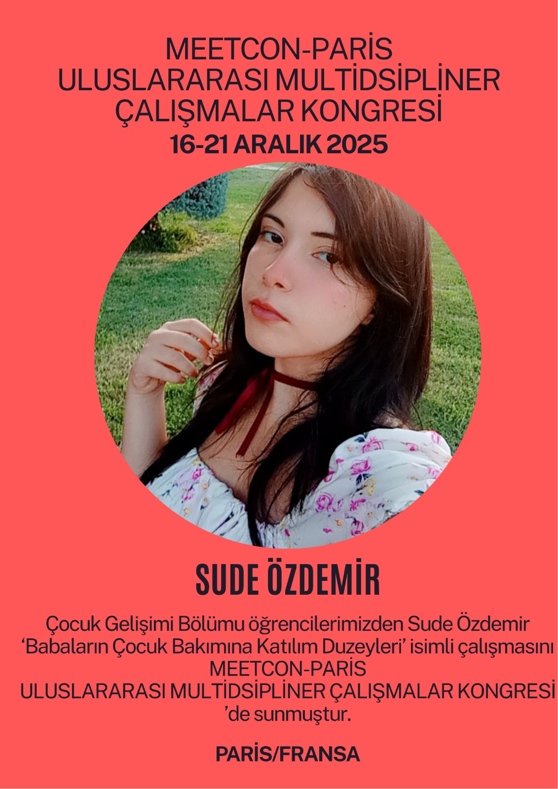 Çocuk Gelişimi Bölümü öğrencileri tarafından 12-13 Aralık 2025 tarihleri arasında düzenlenen “Eğitim, Psikoloji ve Sosyal Araştırmalar Öğrenci Kongresi”, 16-21 Aralık 2025 tarihleri arasında düzenlenen “MEETCON-PARİS Uluslararası Multisipliner Çalışmalar Kongresi” ile 26-29 Kasım 2025 tarihleri arasında düzenlenen “International Education Congress”‘de bildiri sunumları gerçekleştirildi.