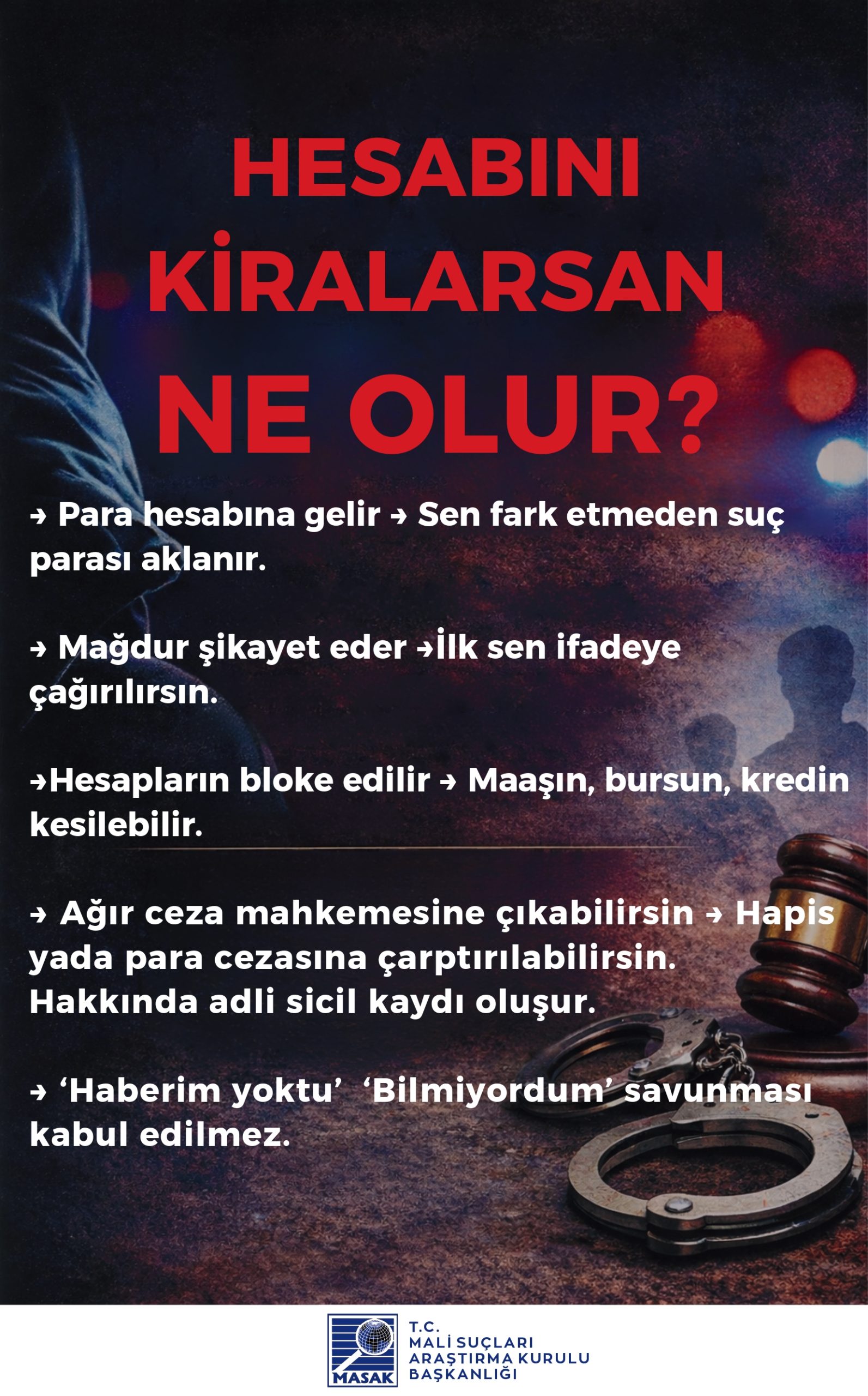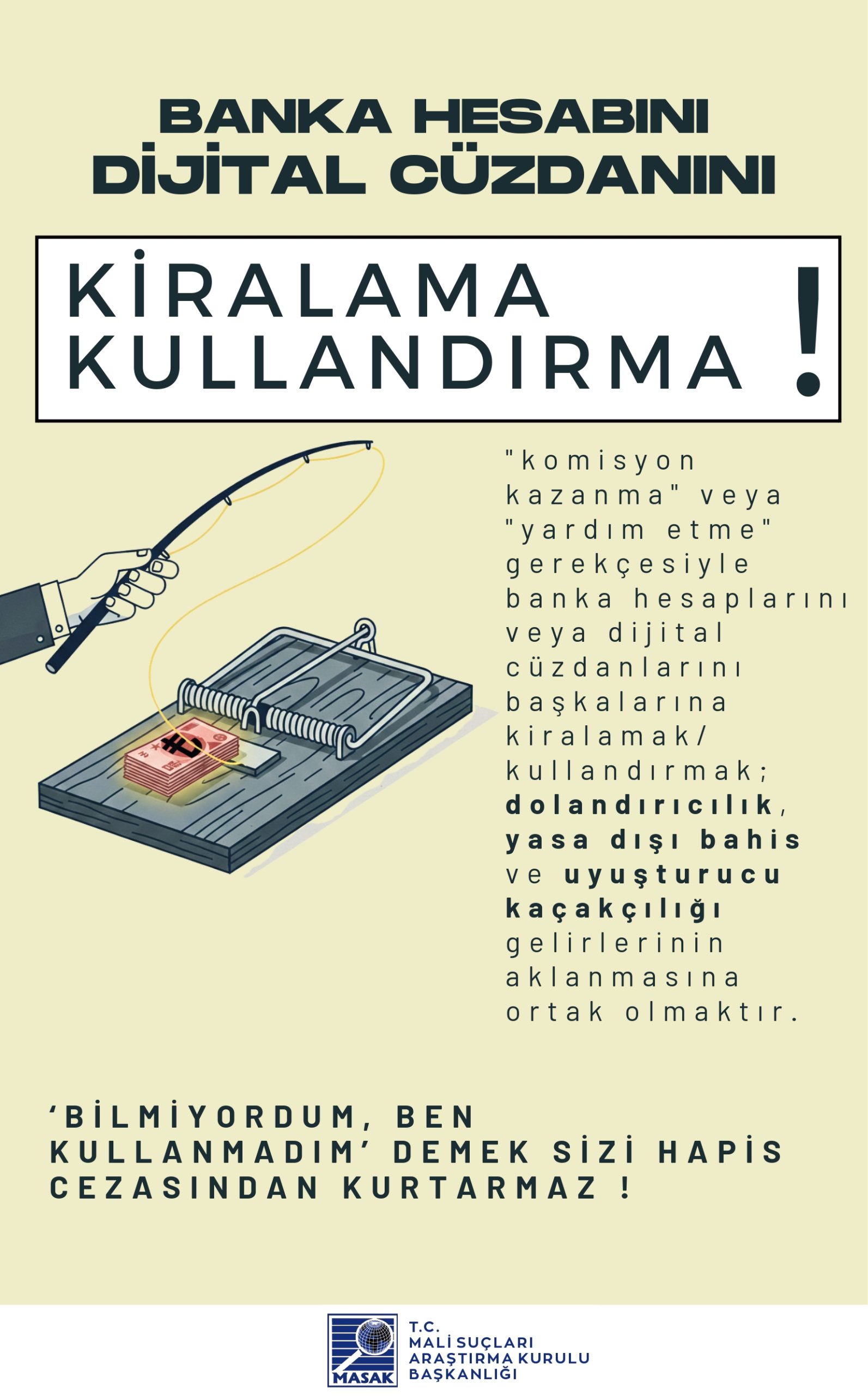 Tanıdığınız ya da tanımadığınız kişilerden gelen, hesap veya IBAN paylaşımı karşılığında kazanç vaadi içeren her türlü teklifi reddetmeniz ve şüpheli durumları derhâl güvenlik yetkililerine bildirmeniz önem arz etmektedir.